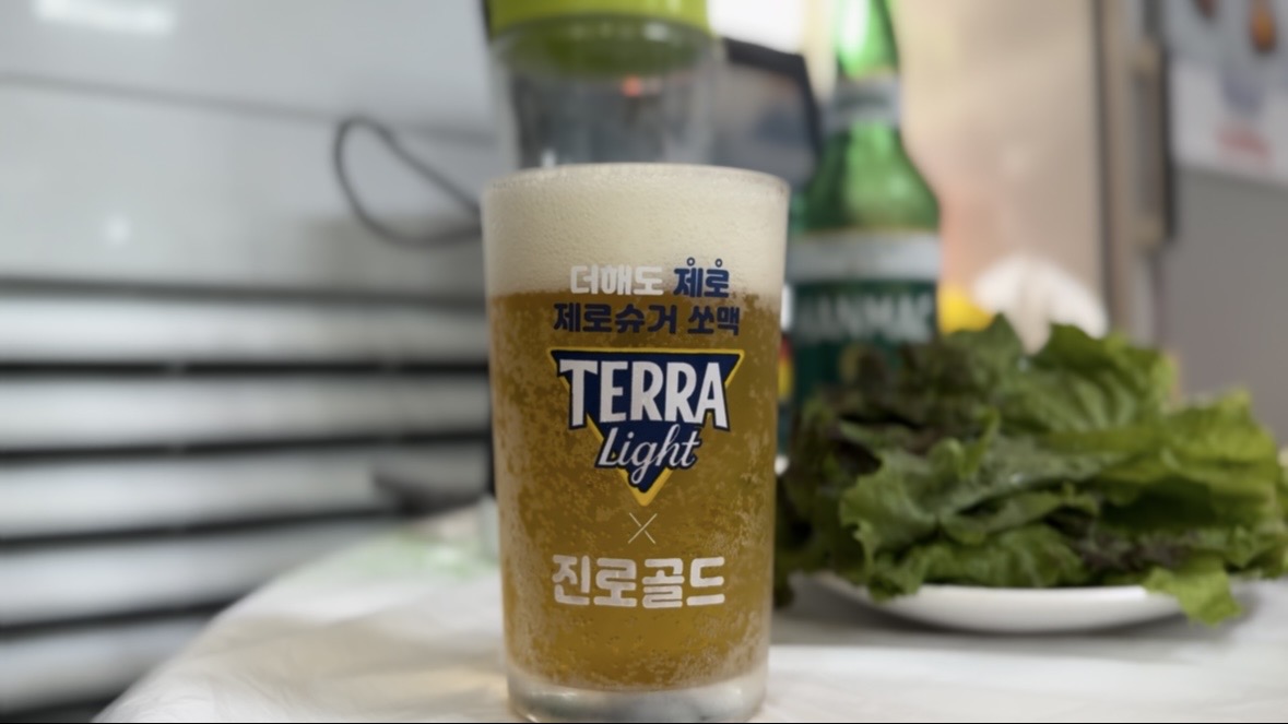 まずは韓国産のビールTERRAで喉を潤します。TERRAは単品で注文するよりも瓶2本セットがお得です