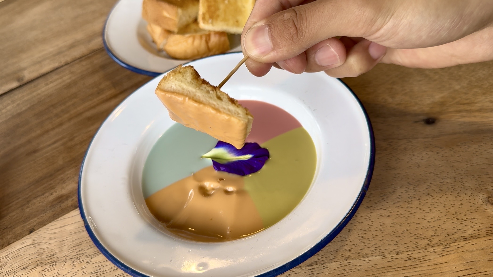 カノムパンサンカヤーはタイの人気のトーストなどのパンをココナッツミルクやカスタードにつけて食べるスイーツです。タイ語ではカノム(ขนมปัง)はパンサンカヤー(สังขยาはカスタードクリームを意味します