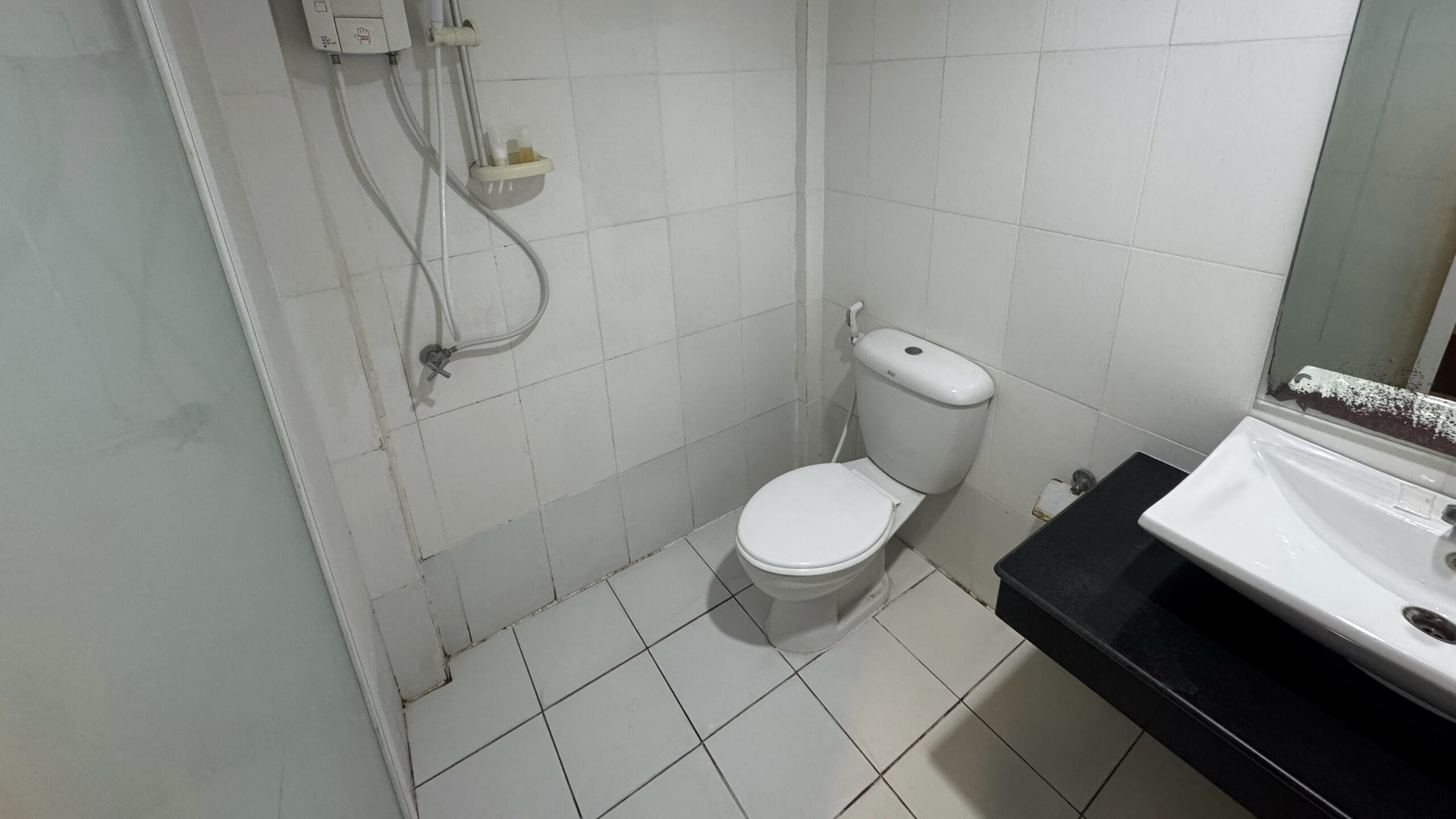 こちらはバスルーム。写真からわかるようにトイレ近くにシャワーノズルがありますのでシャワーを使うともちろん水浸しに