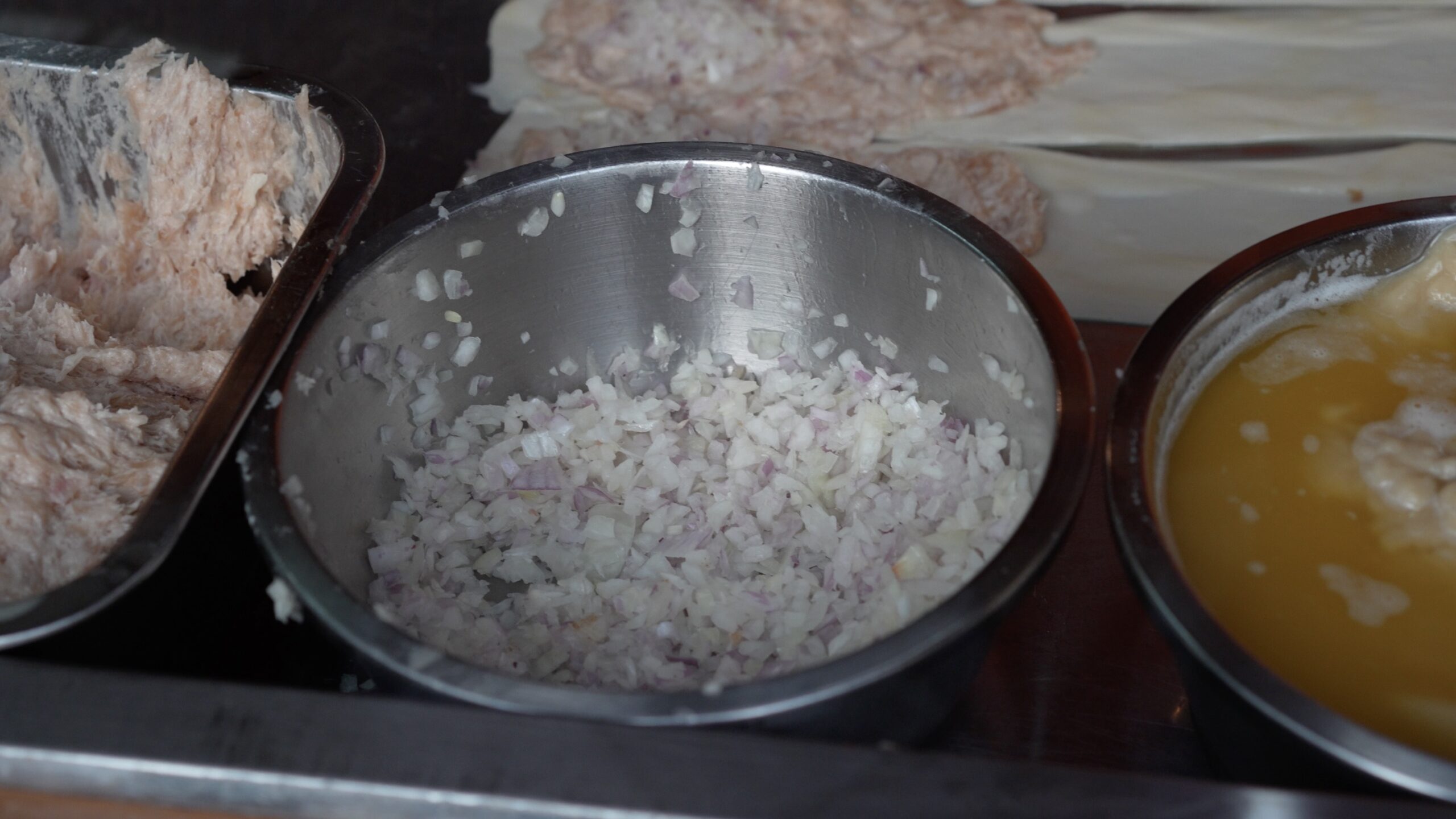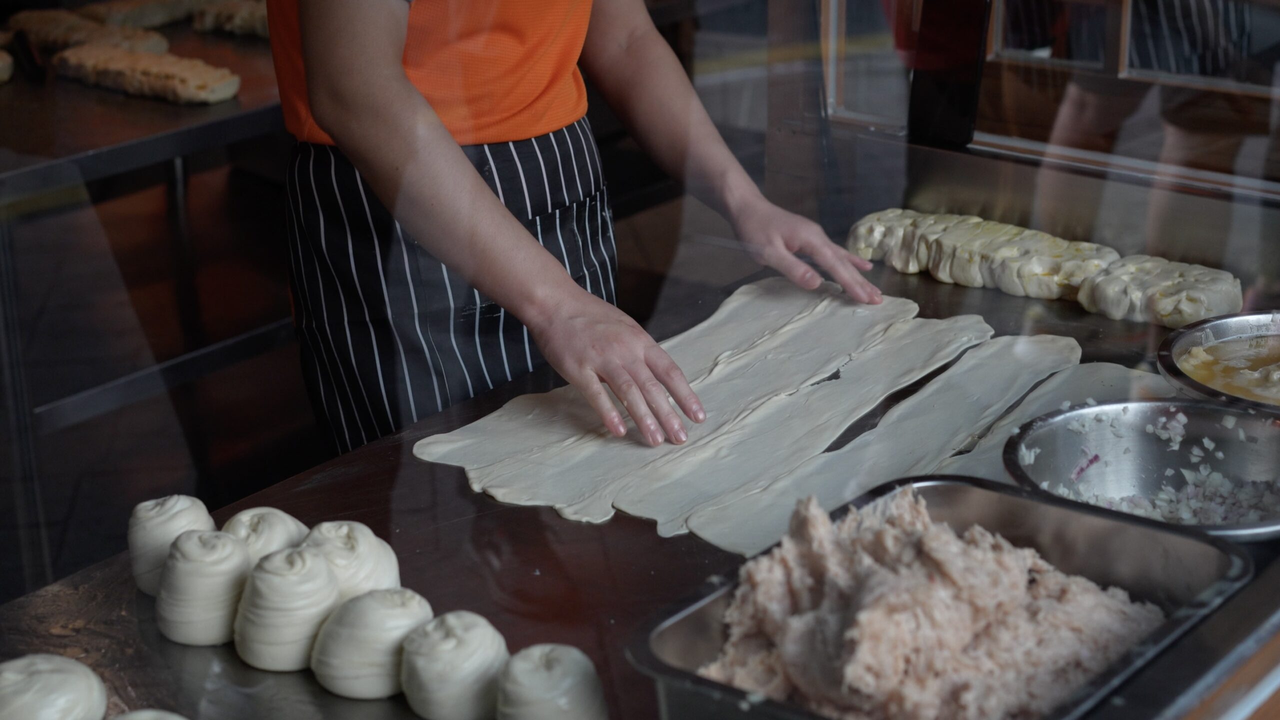 さらに麺棒で薄く伸ばしてミンチ状のひき肉と刻んだ玉ねぎを生地の上へ