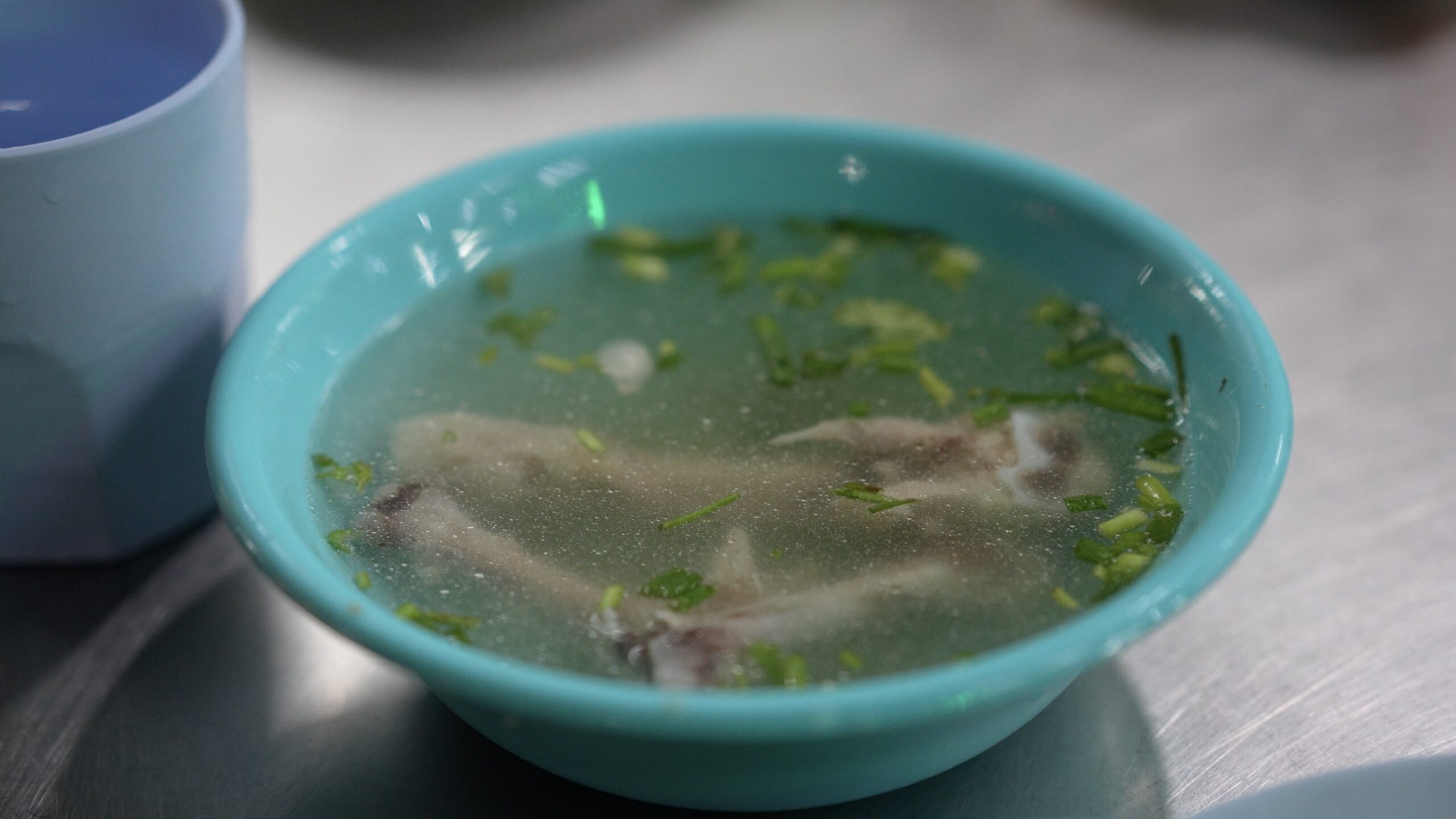 キラキラと油の浮いた透き通るスープ。飲んでみるとしっかりと鶏の出汁の効いたあっさりした味わい