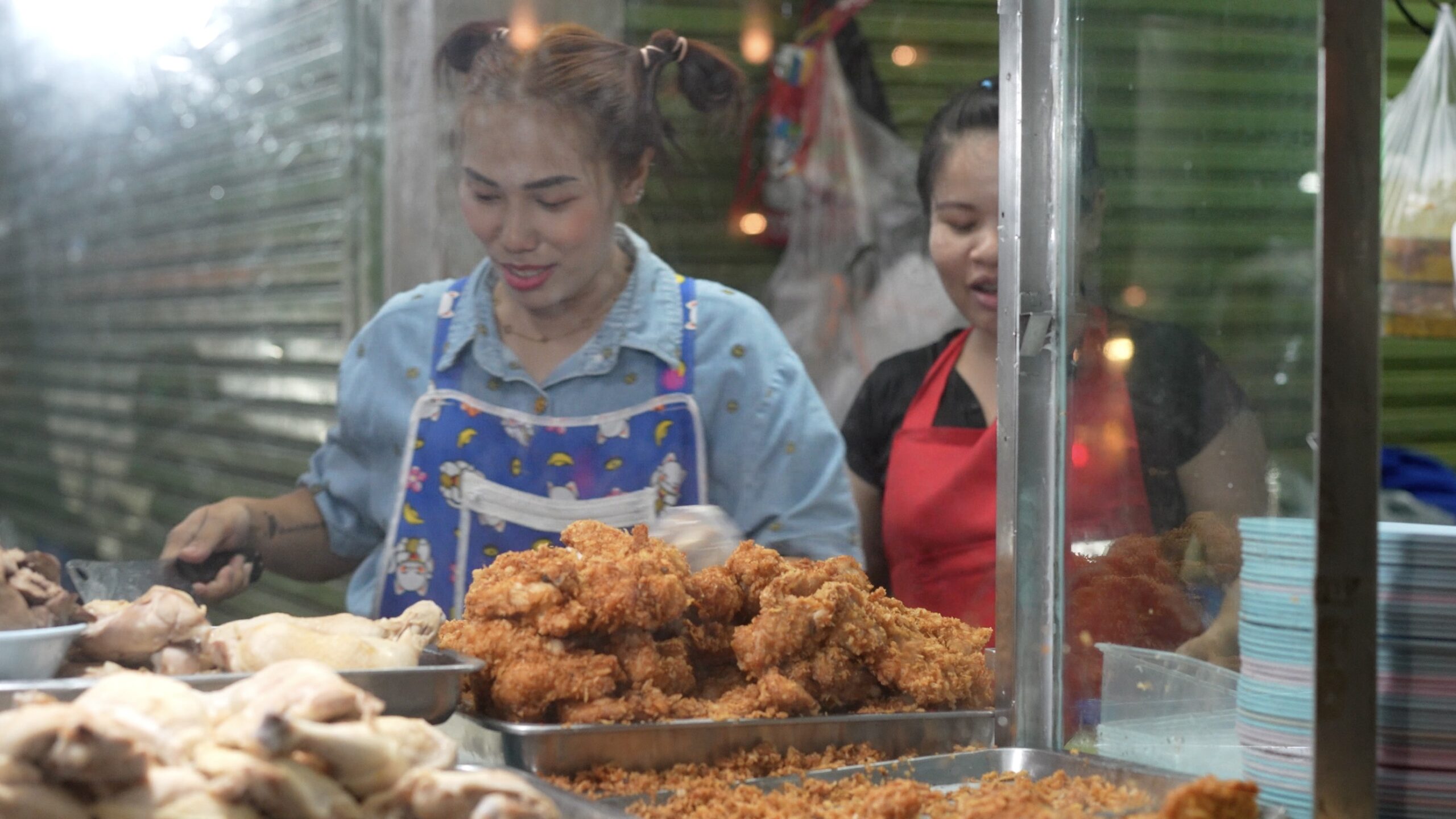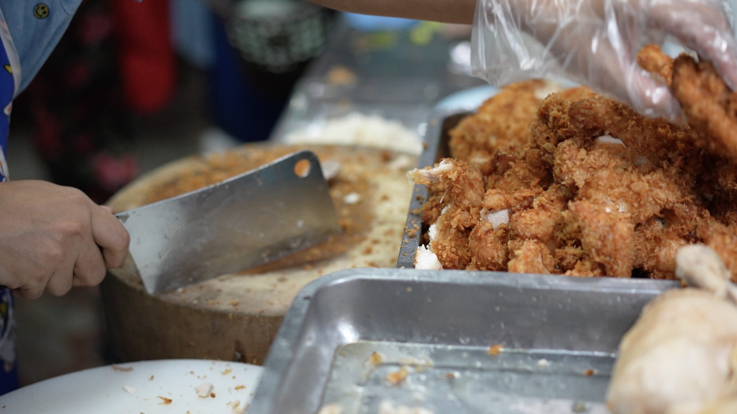 そしてこちらでは揚げたチキンをザクザクと切って行きます