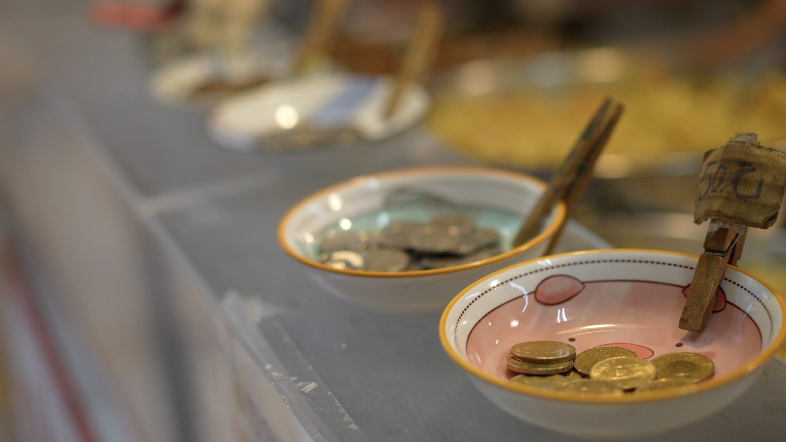 こちらのお皿にコインをお札は別の場所へ。お釣りはこちらから自分でもらいます